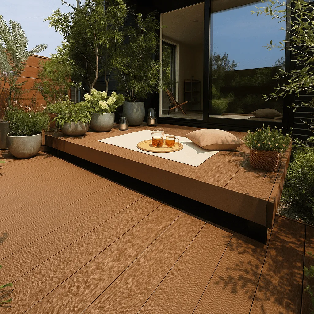 リウッド素材のフェンスを組み合わせると、デッキと色味や質感が揃い、外観全体に統一感が生まれます。住宅外観との調和を意識すれば、より上品でおしゃれな印象に仕上がります。