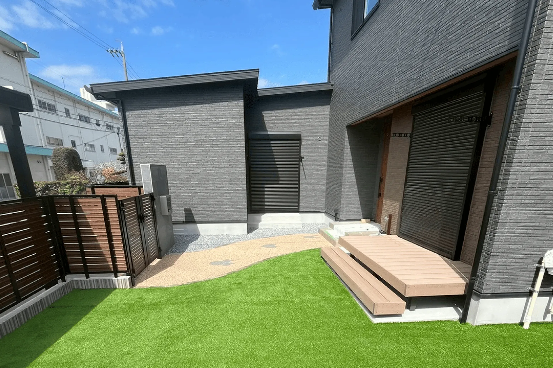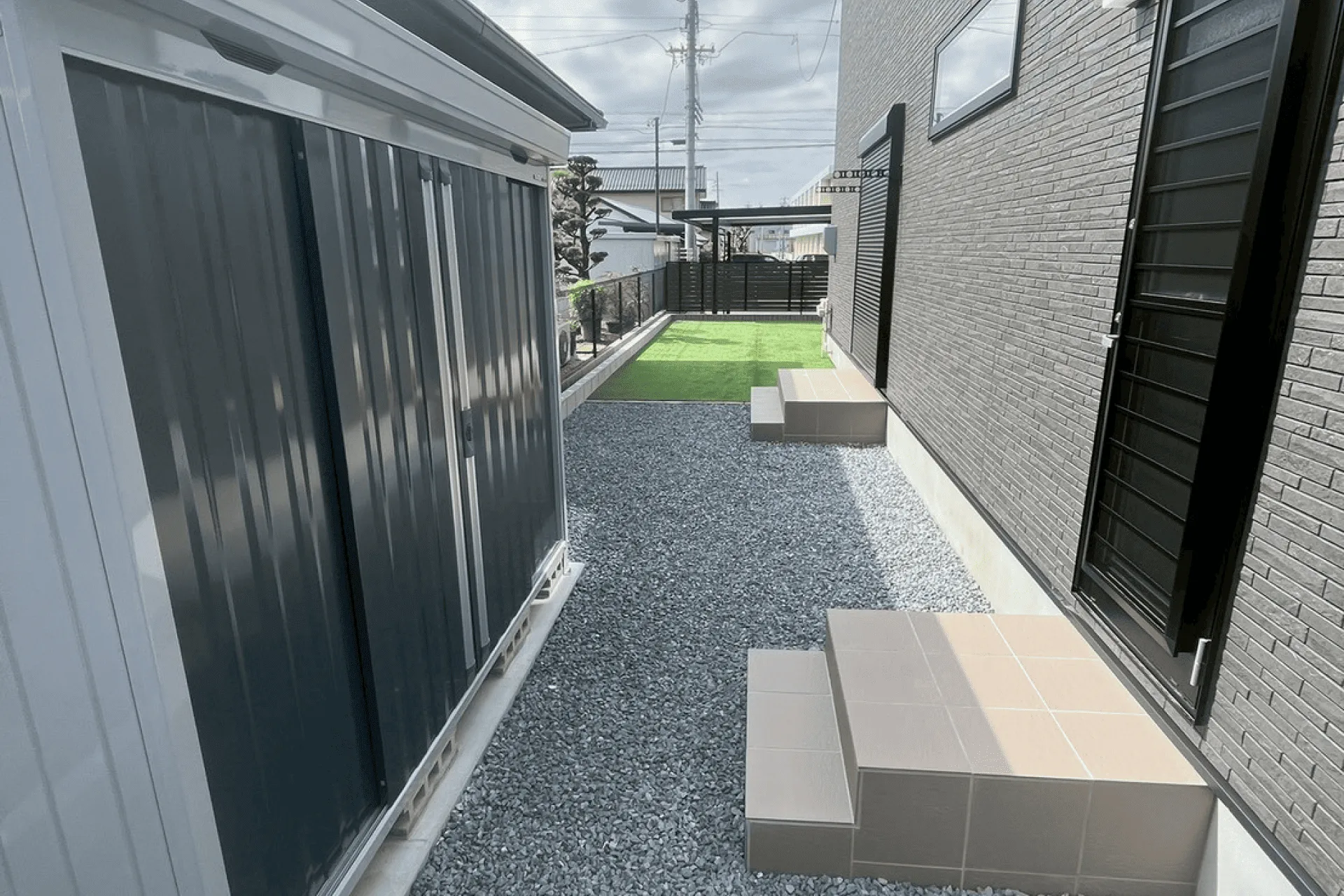 建物のサイドヤードから庭にかけて、鮮やかな人工芝と落ち着いたトーンの砂利を組み合わせ、機能的で美しい空間に仕上げました。土の部分をなくすことで、毎年の悩み種である雑草対策も万全。人工芝の鮮やかなグリーンが、モダンな外壁の質感を引き立て、お住まい全体をパッと明るい印象に変えてくれます。
