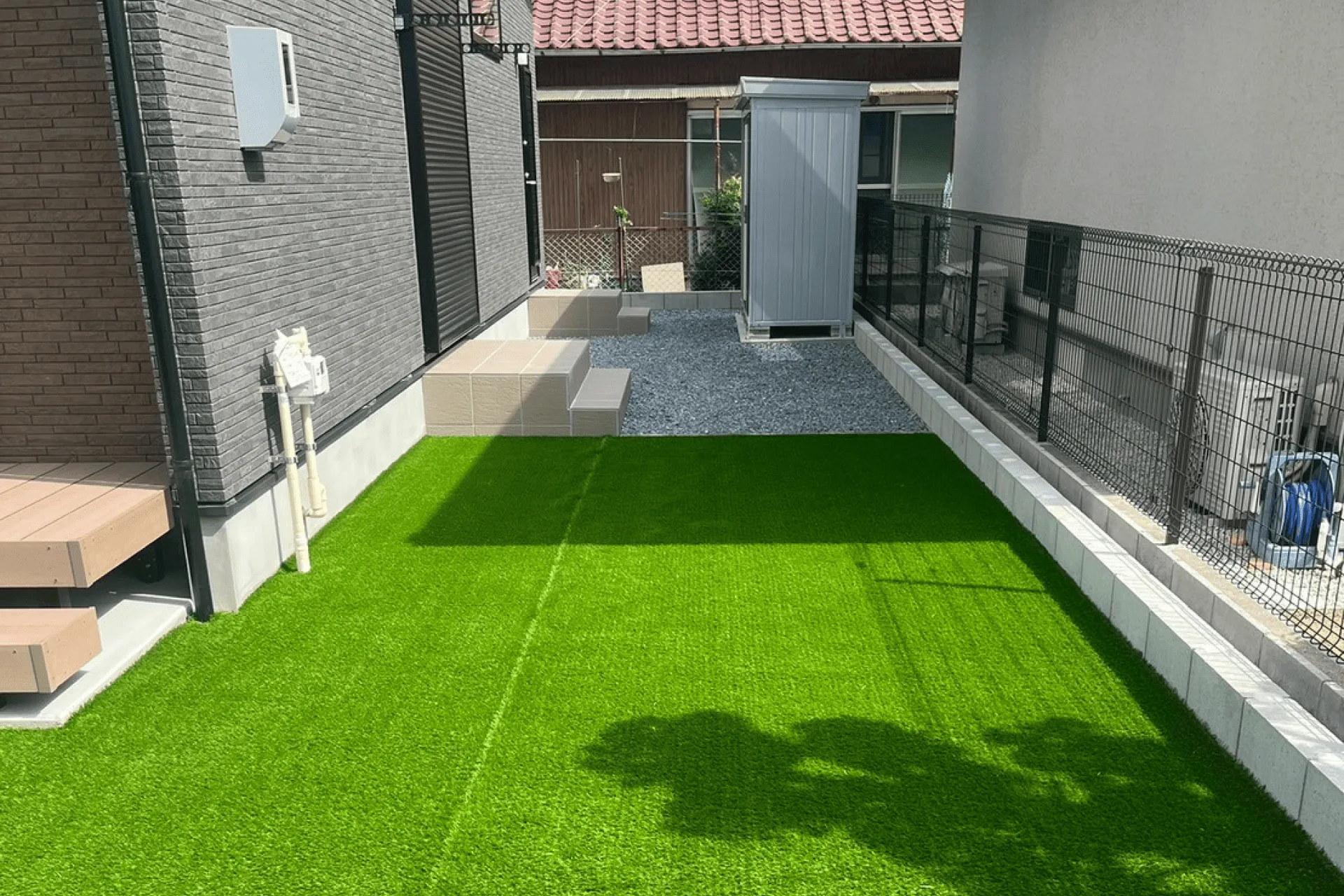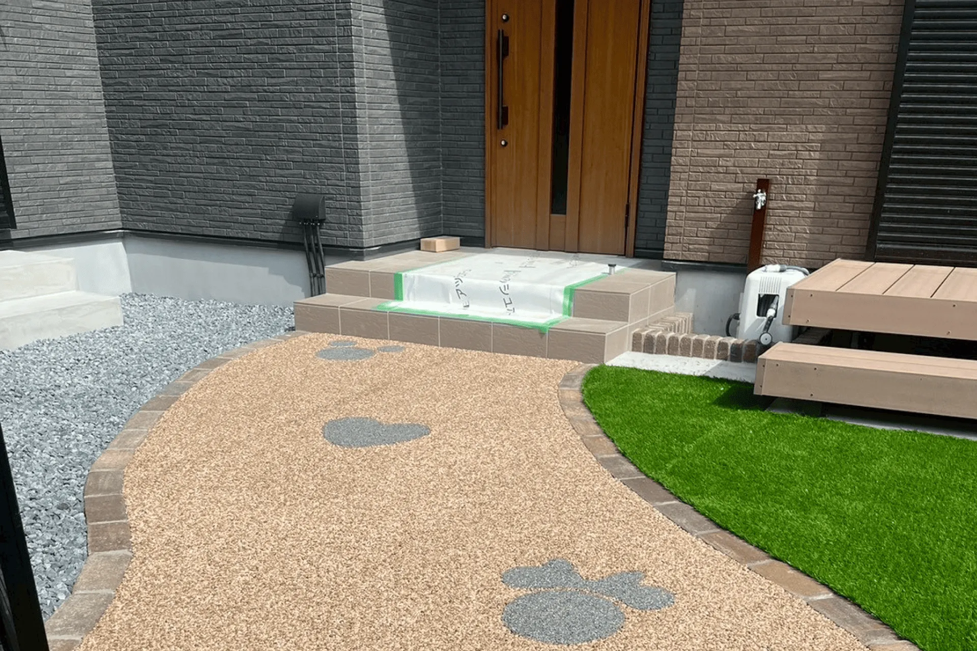 今回の外構工事では、施工のポイントでも一部触れたように、スタイリッシュな外観に合わせたデザイン性はもちろん、「メンテナンスの軽減」と「防犯・プライバシーの確保」という、生活に直結する課題をトータルで解決しました。人工芝の鮮やかなグリーンと、遊び心のあるアプローチ。そして死角をカバーする砂利敷きとフェンス。これらをバランスよく配置することで、単なる「家の外側」ではなく、家族が安心して過ごせる「価値ある空間」へと生まれ変わりました。「庭の手入れが大変」「外からの視線が気になる」「デッドスペースを活用したい」といったお悩みをお持ちの方は、ぜひ一度ご相談ください。お客様のライフスタイルに寄り添った、最適な外構プランをご提案いたします。