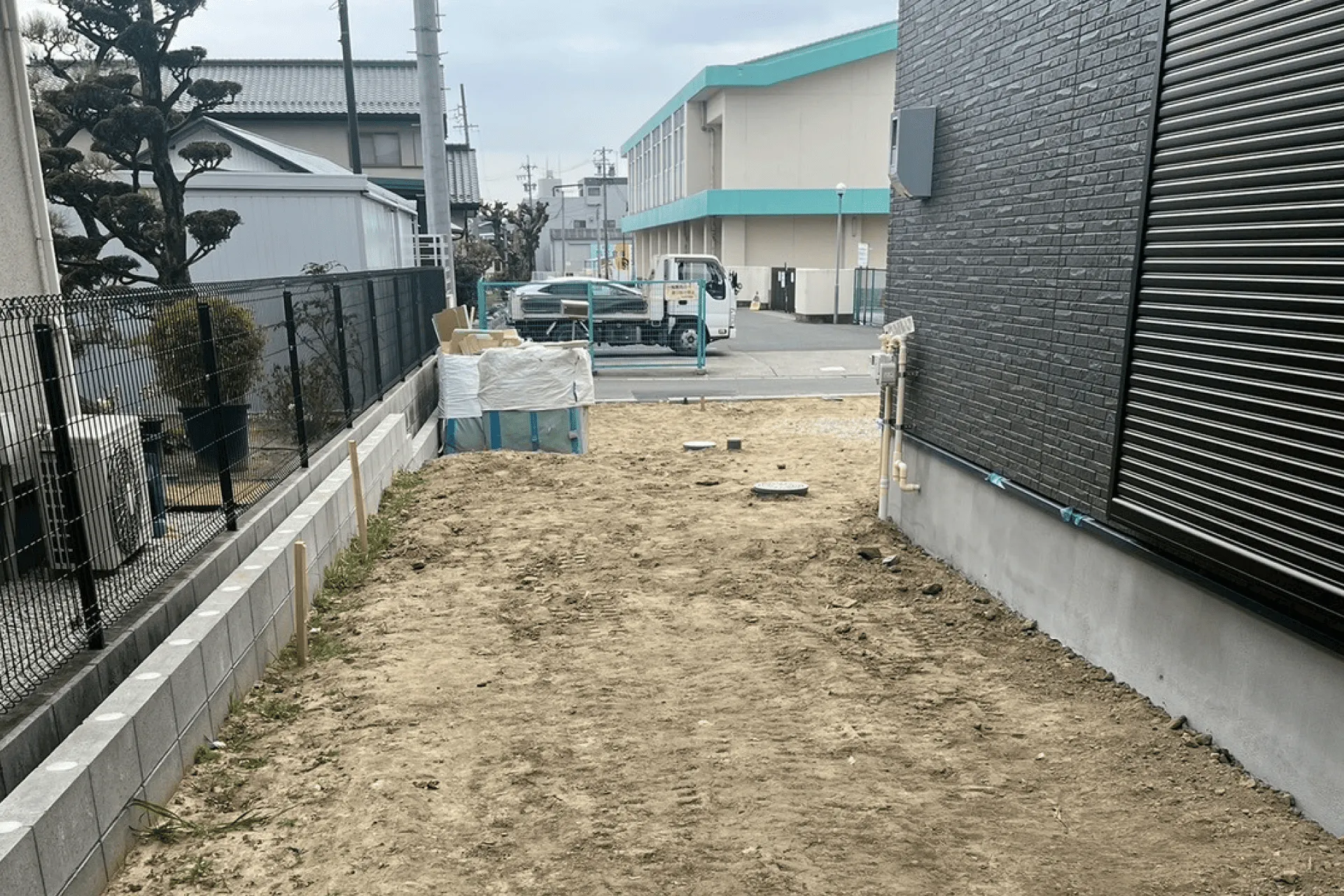 建物脇の通路部分に、人工芝を敷設(ふせつ)するための下地作りを行っている施工前の様子です。現在はまだ土が剥き出しの状態で、地面に見える複数の排水マスの高さを、最終的な人工芝の厚みに合わせて正確に調整する必要があります。